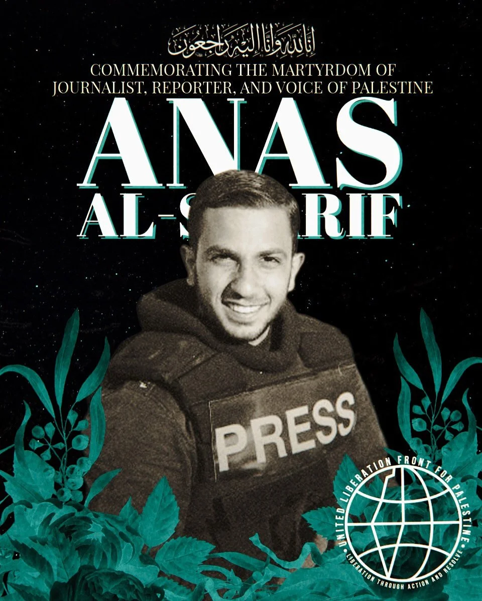 The United Liberation Front For Palestine expresses incredible grief and sorrow after confirming the martyrdom of beloved reporter and voice of Palestine, Anas Al-Sharif, who was targeted moments ago by the Zionist terrorists of the israeli genocidal forces, after bombing the entrance of Al-Shifa Hospital in Gaza.
