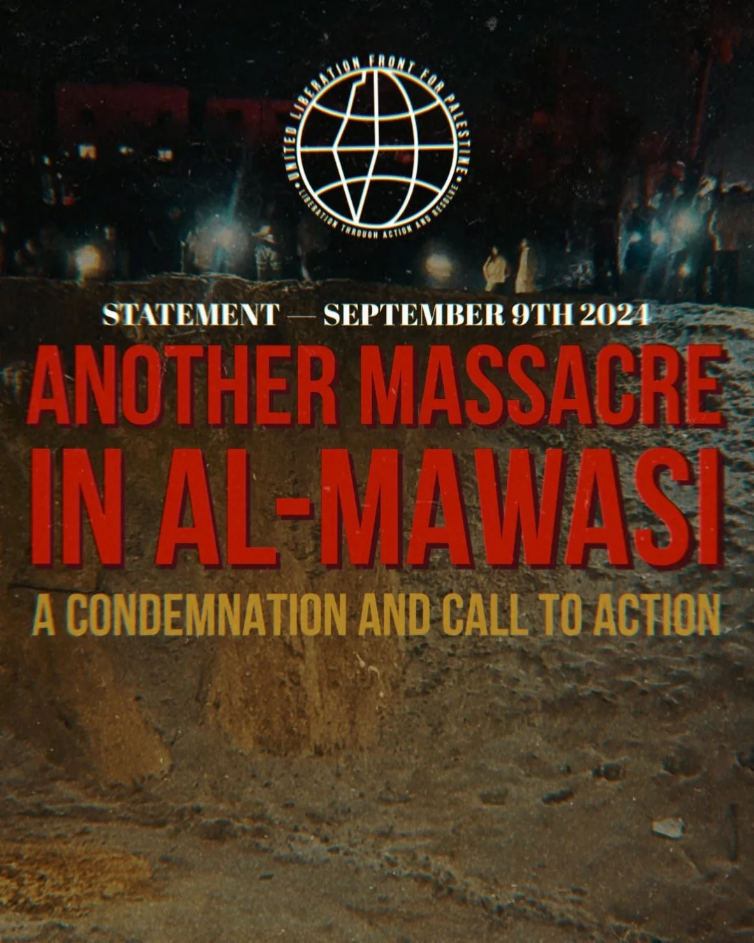 The United Liberation Front for Palestine condemns in the strongest terms, the abhorrent massacre perpetuated by the Zionist entity that has claimed the lives of more than 100 Palestinians, among them entire families who were sheltering at the Al-Mawasi Encampment in Khan Younis.